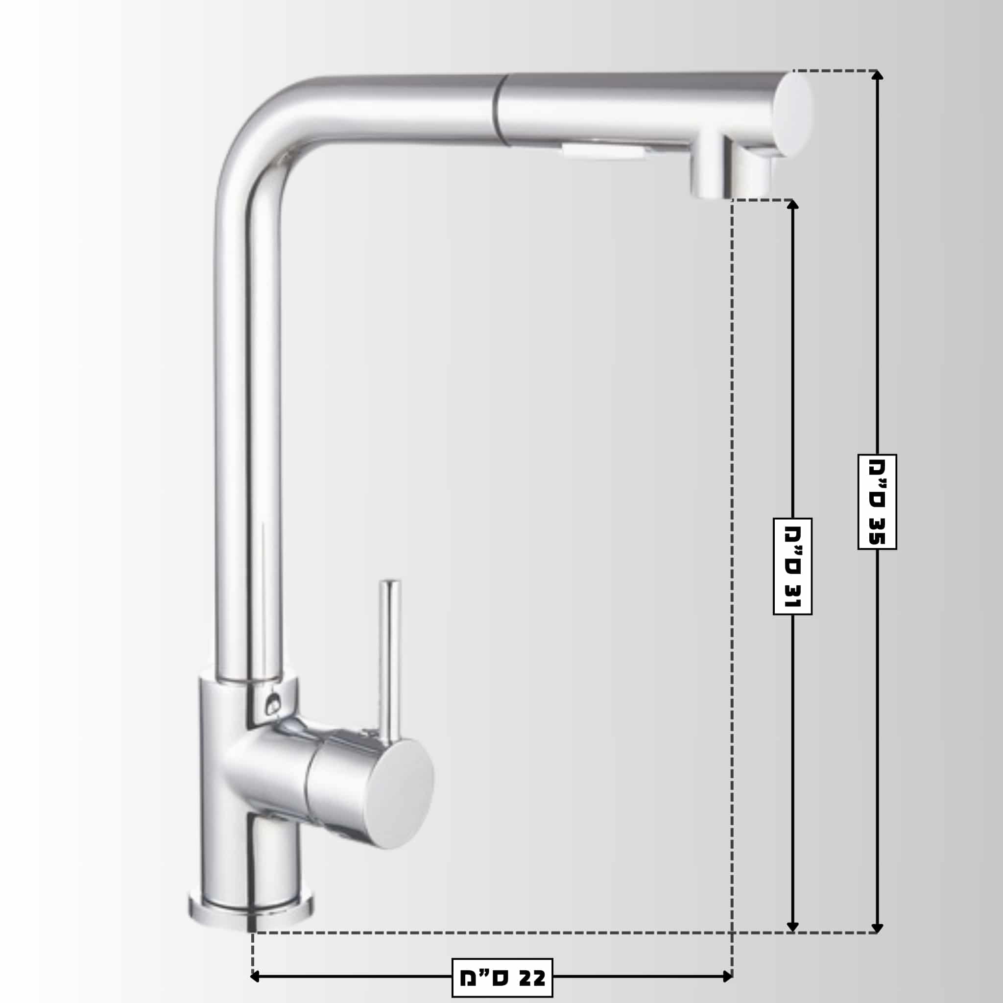 ברז מטבח נשלף עם פייה בעלת 2 מצבי זרימה – כרום. גימור: כרום. מידות: – גובה כללי: 35 ס"מ. – גובה פייה: 31 ס"מ. – מרחק בין הבסיס לפייה: 22 ס"מ.