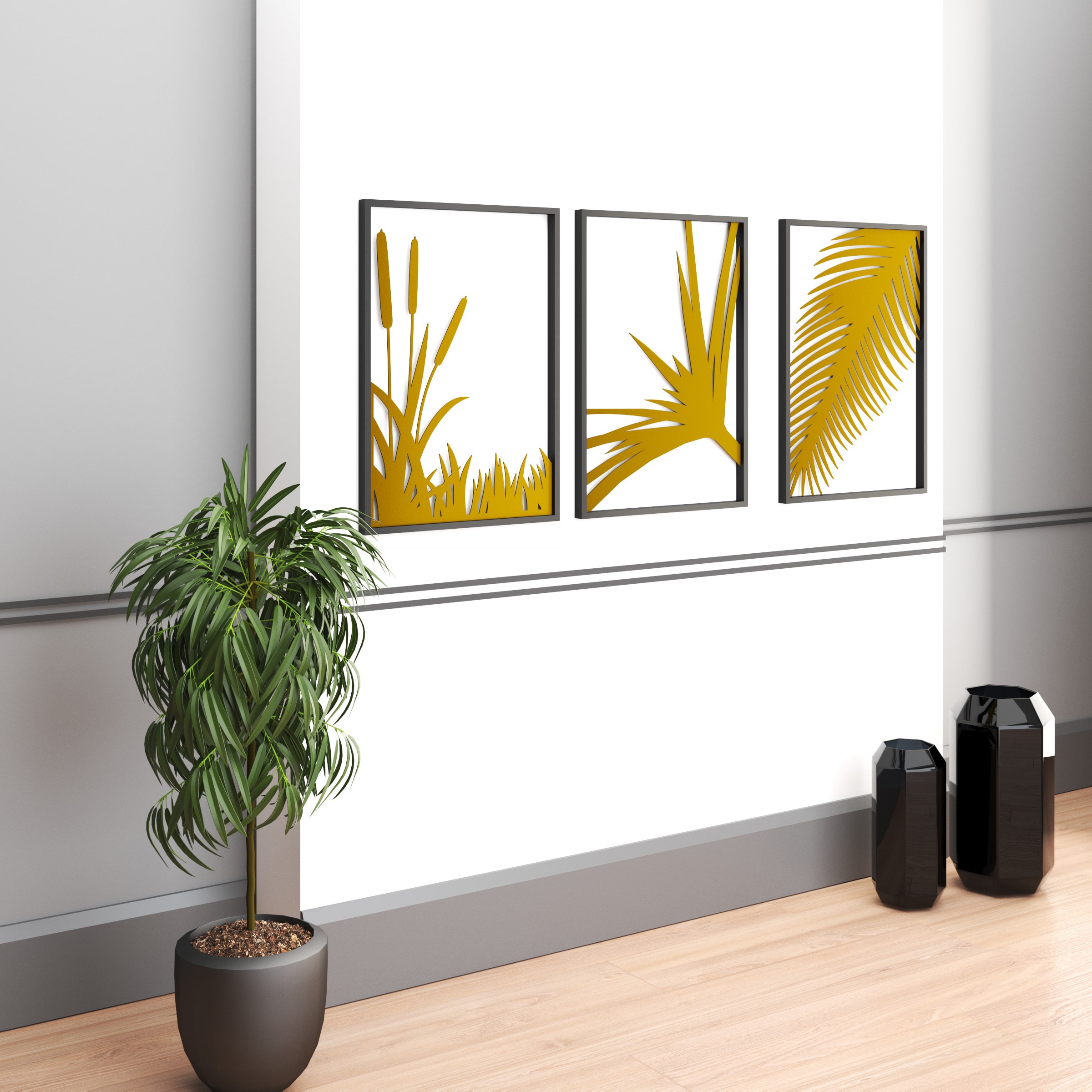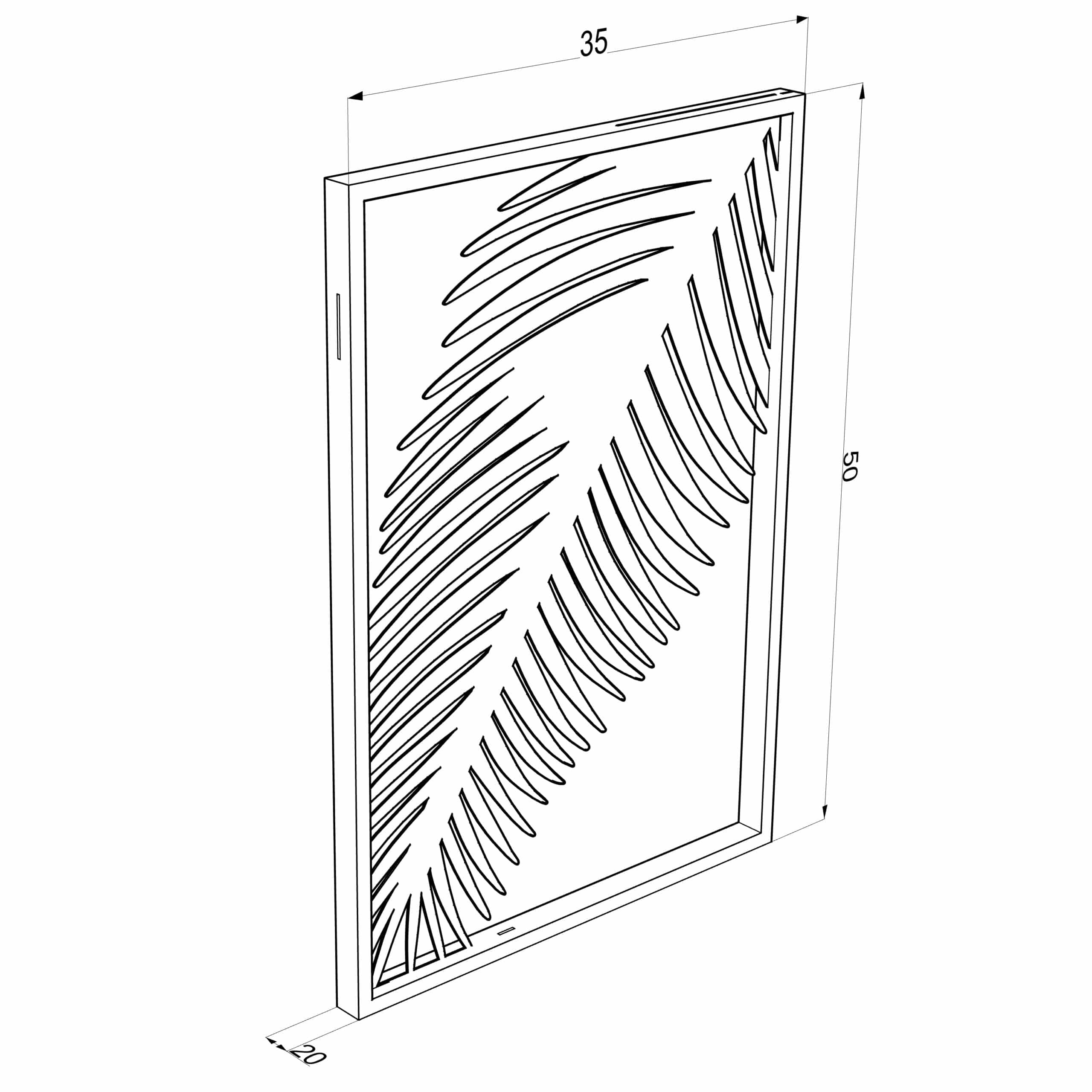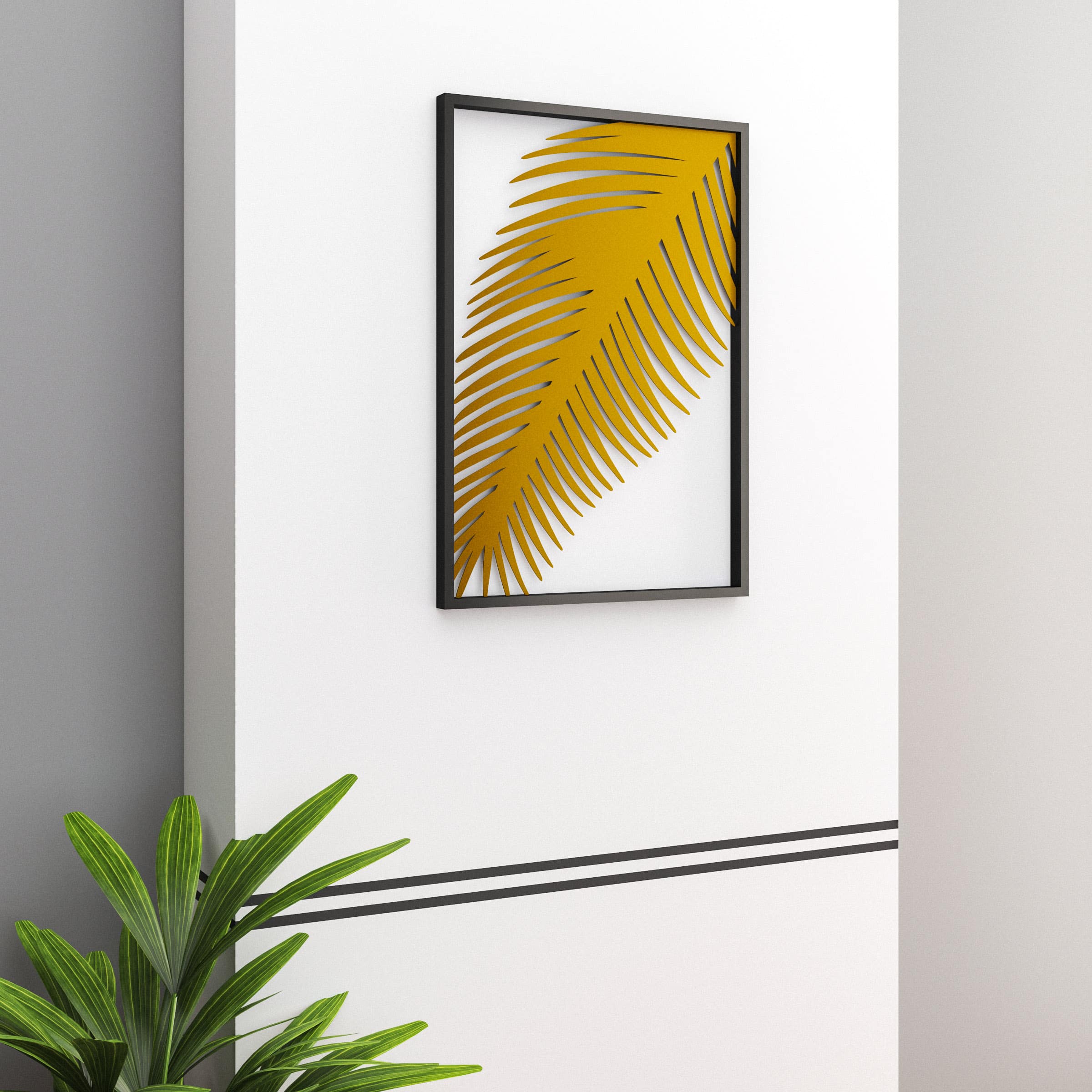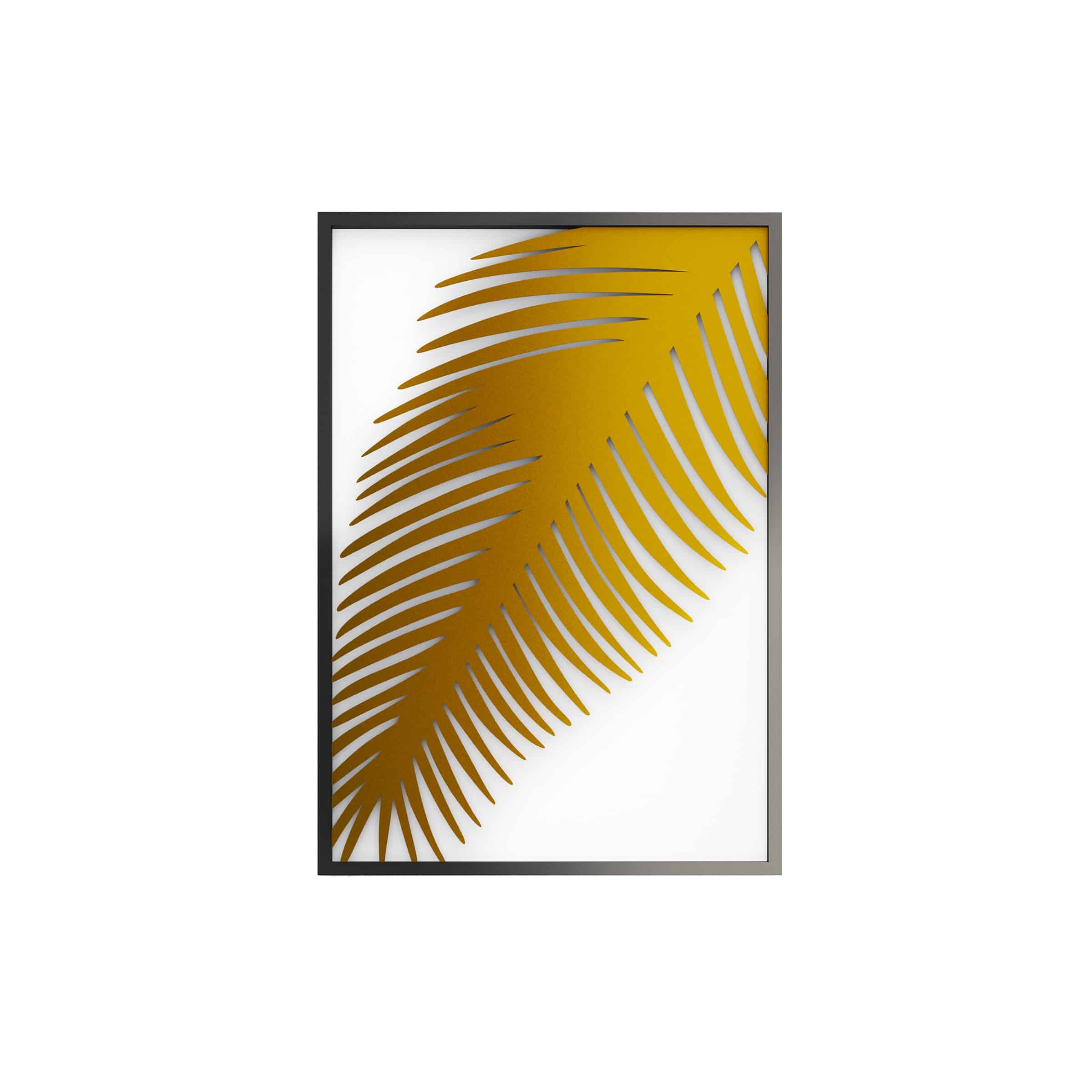 תמונה דקורטיבית ומודרנית במסגרת שחורה מברזל עם עיטור ענף דקל זהב.