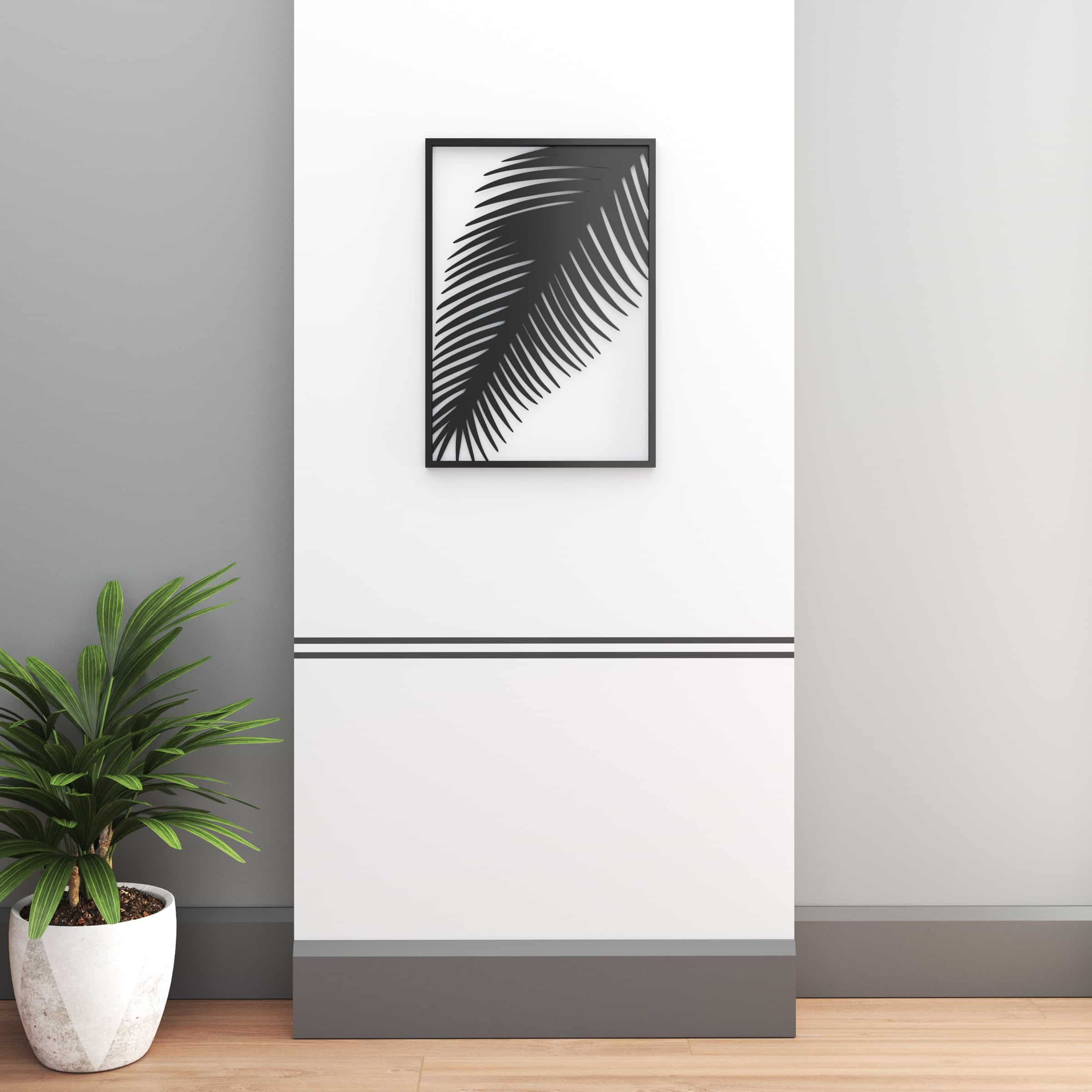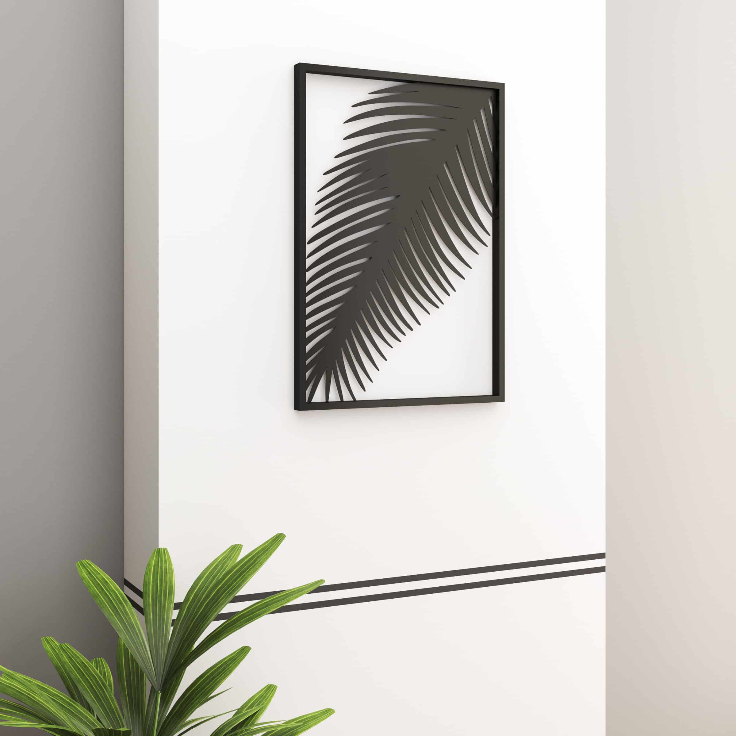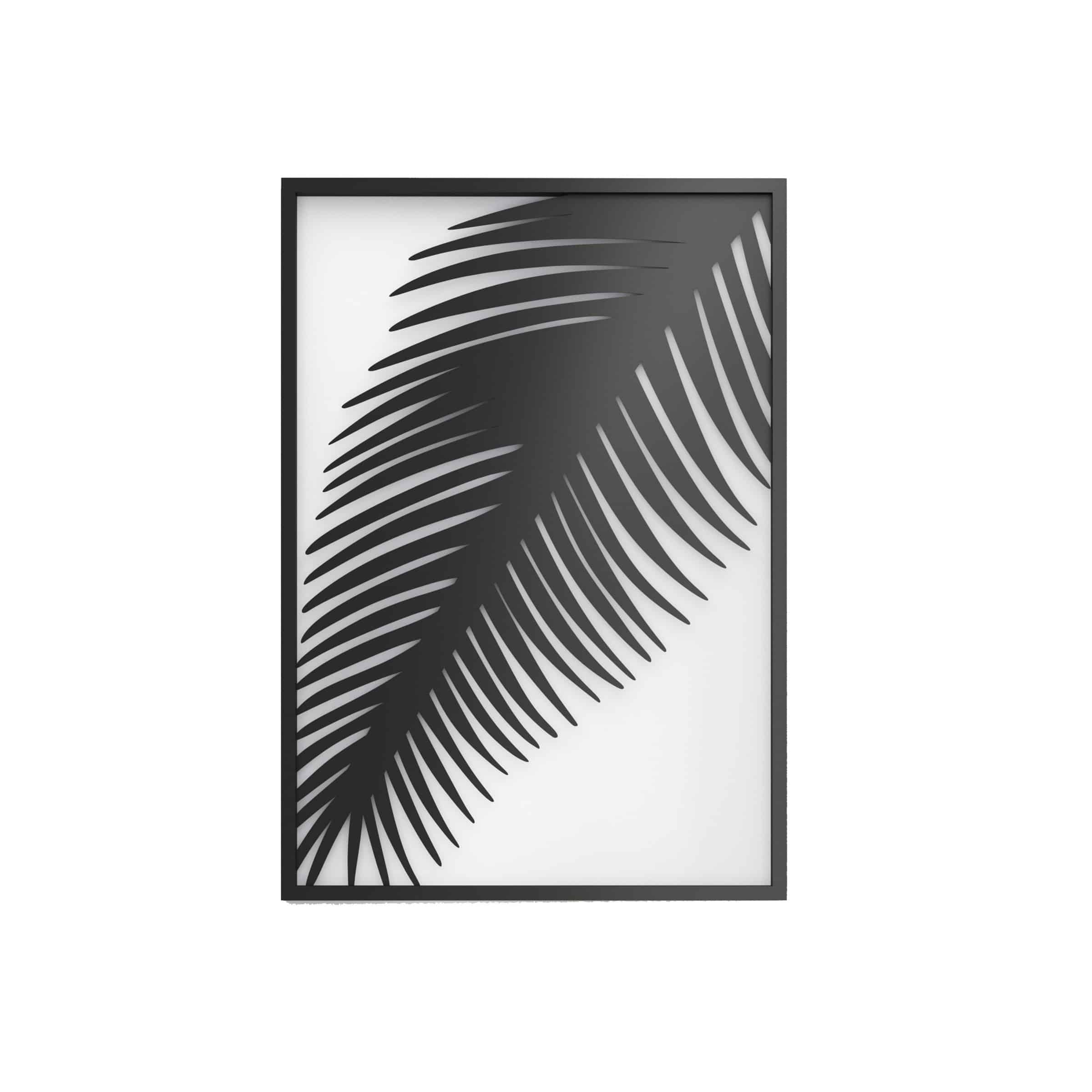 תמונה דקורטיבית ומודרנית במסגרת שחורה מברזל עם עיטור ענף דקל.